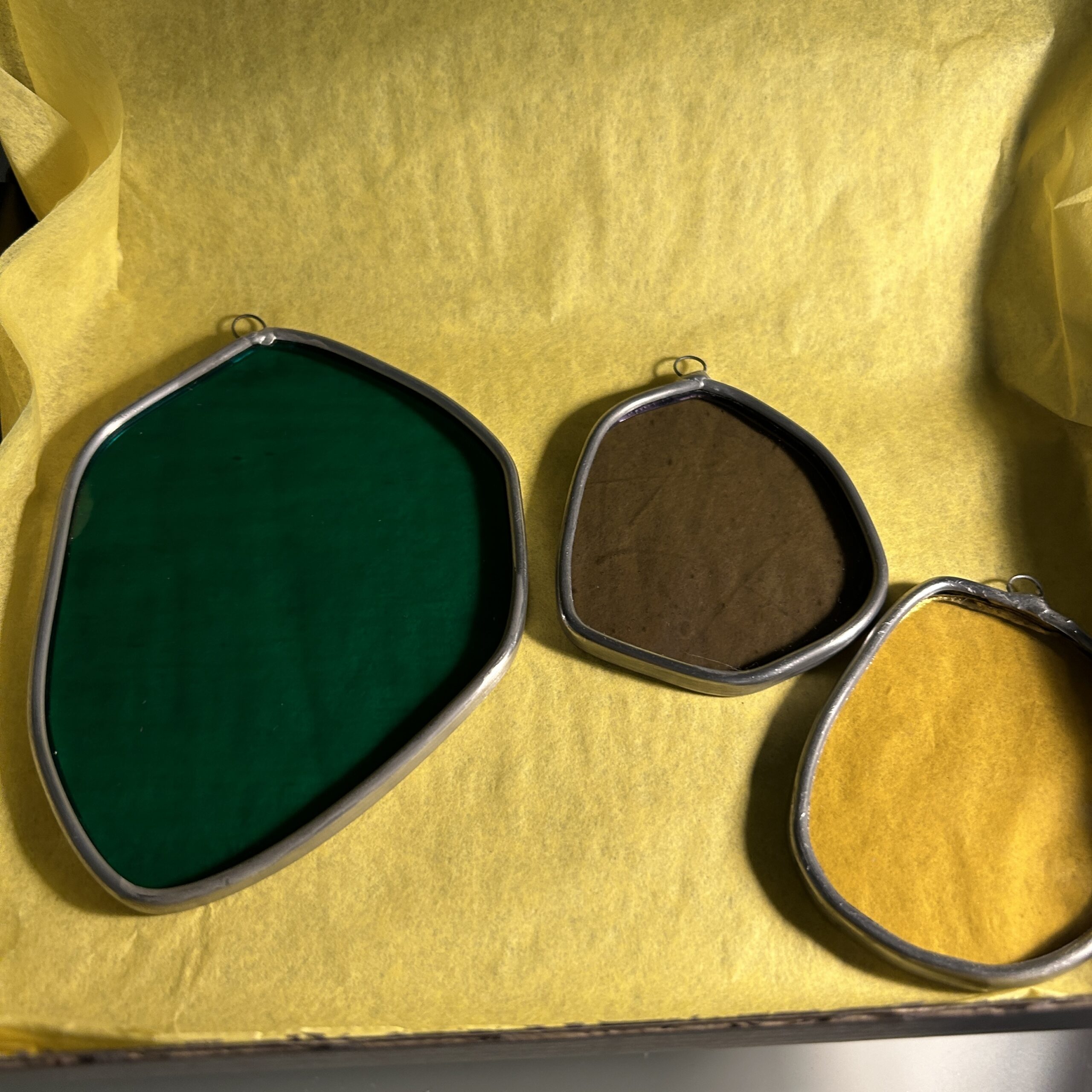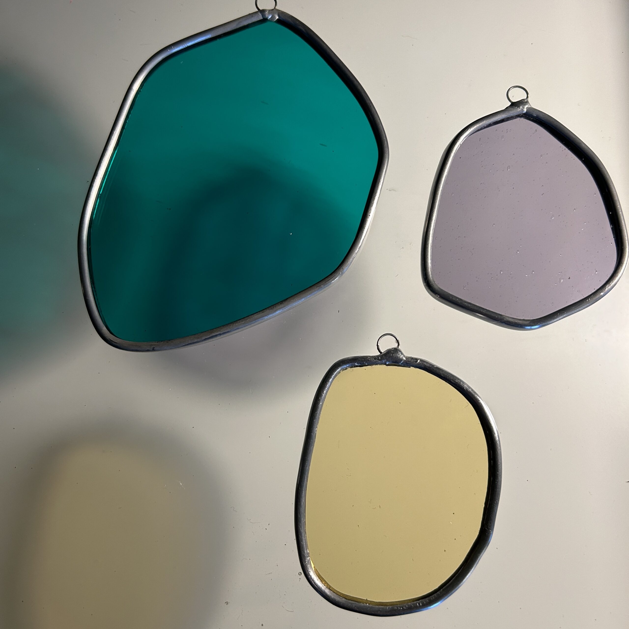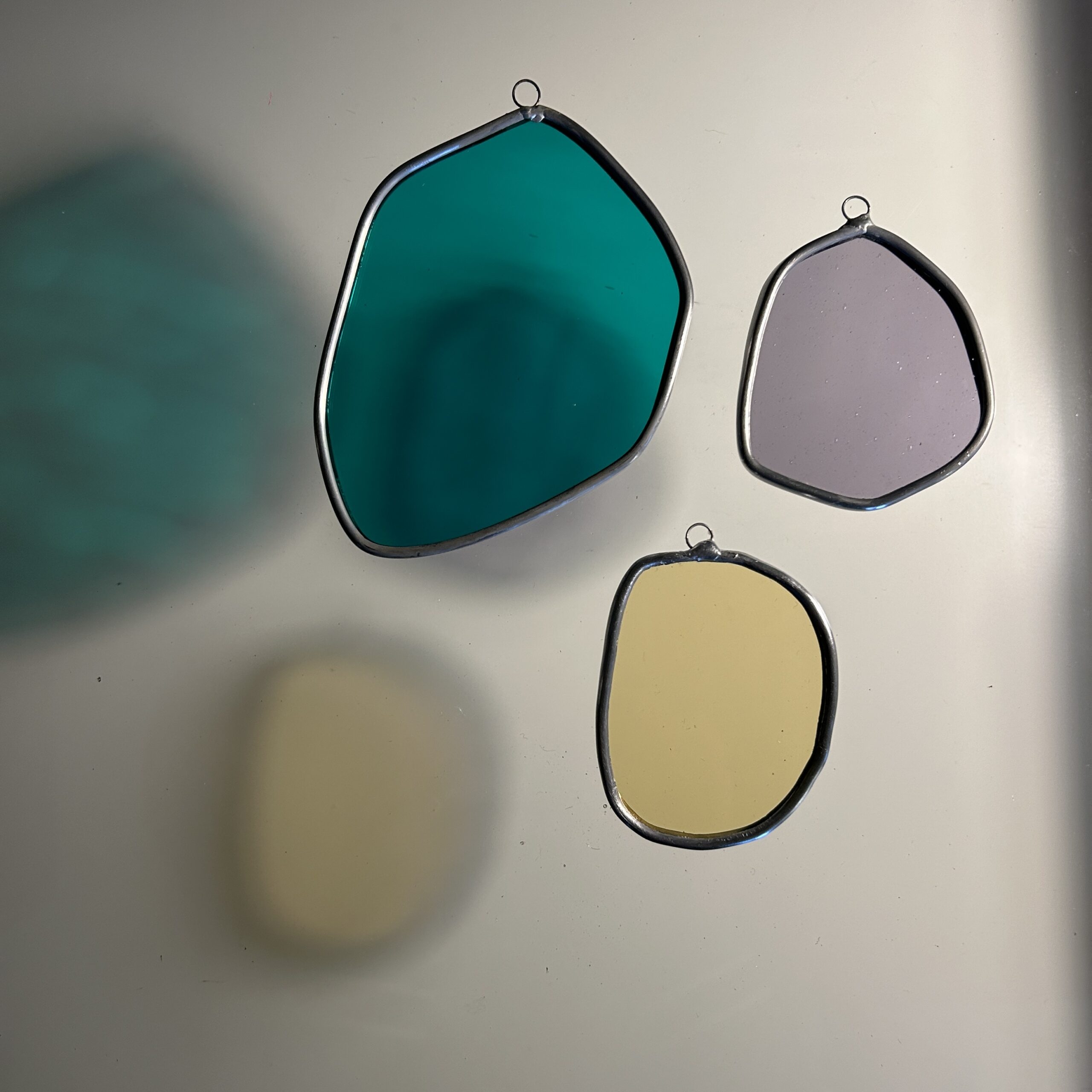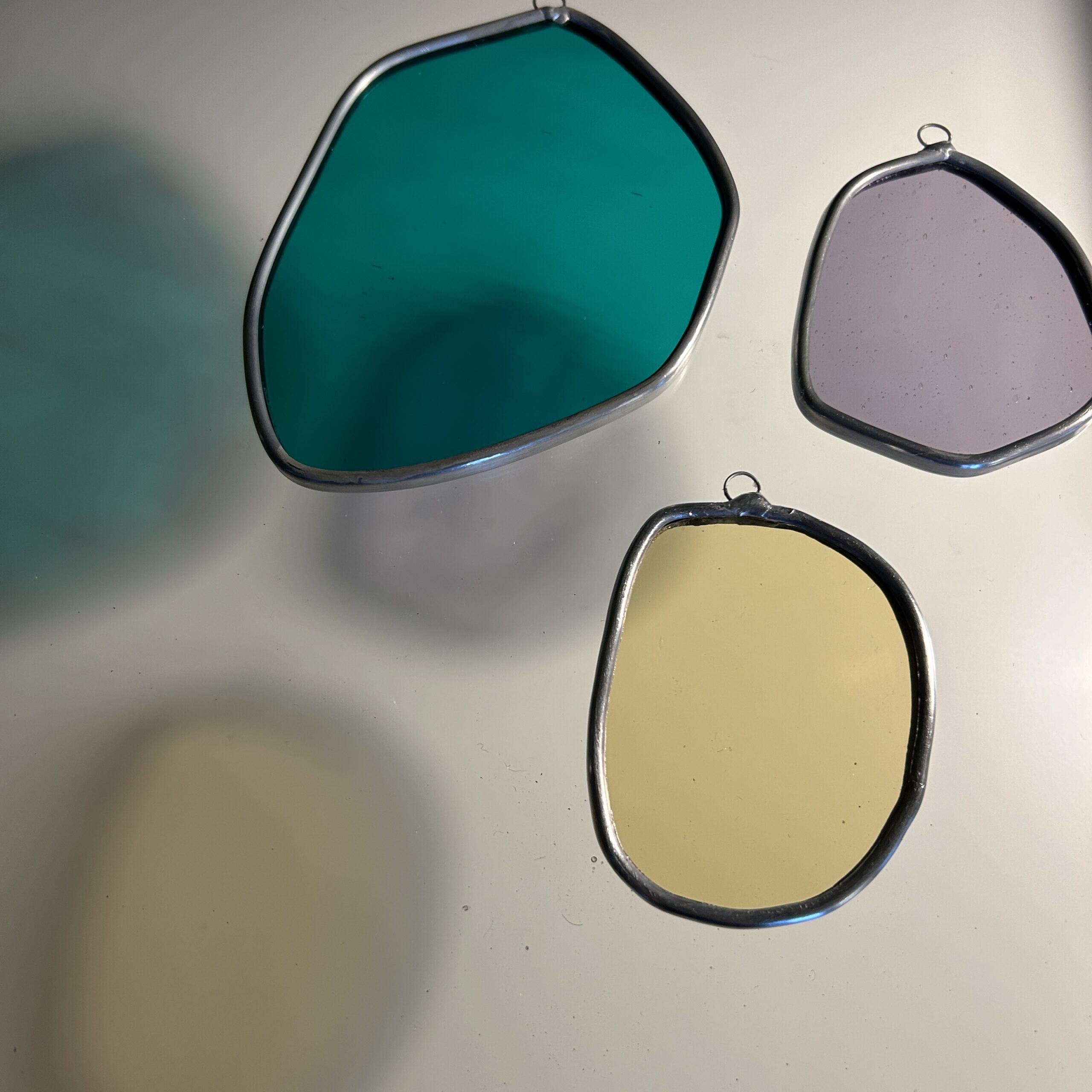 Het glas is is oud, antiek glas, omlijst met (nieuw) lood. Elke hanger heeft een oogje waarmee je hem op kan hangen met bijvoorbeeld onzichtbaar visdraad of een ketting. Of bijvoorbeeld mooi aan de muur kunt bevestigen met een spijkertje.