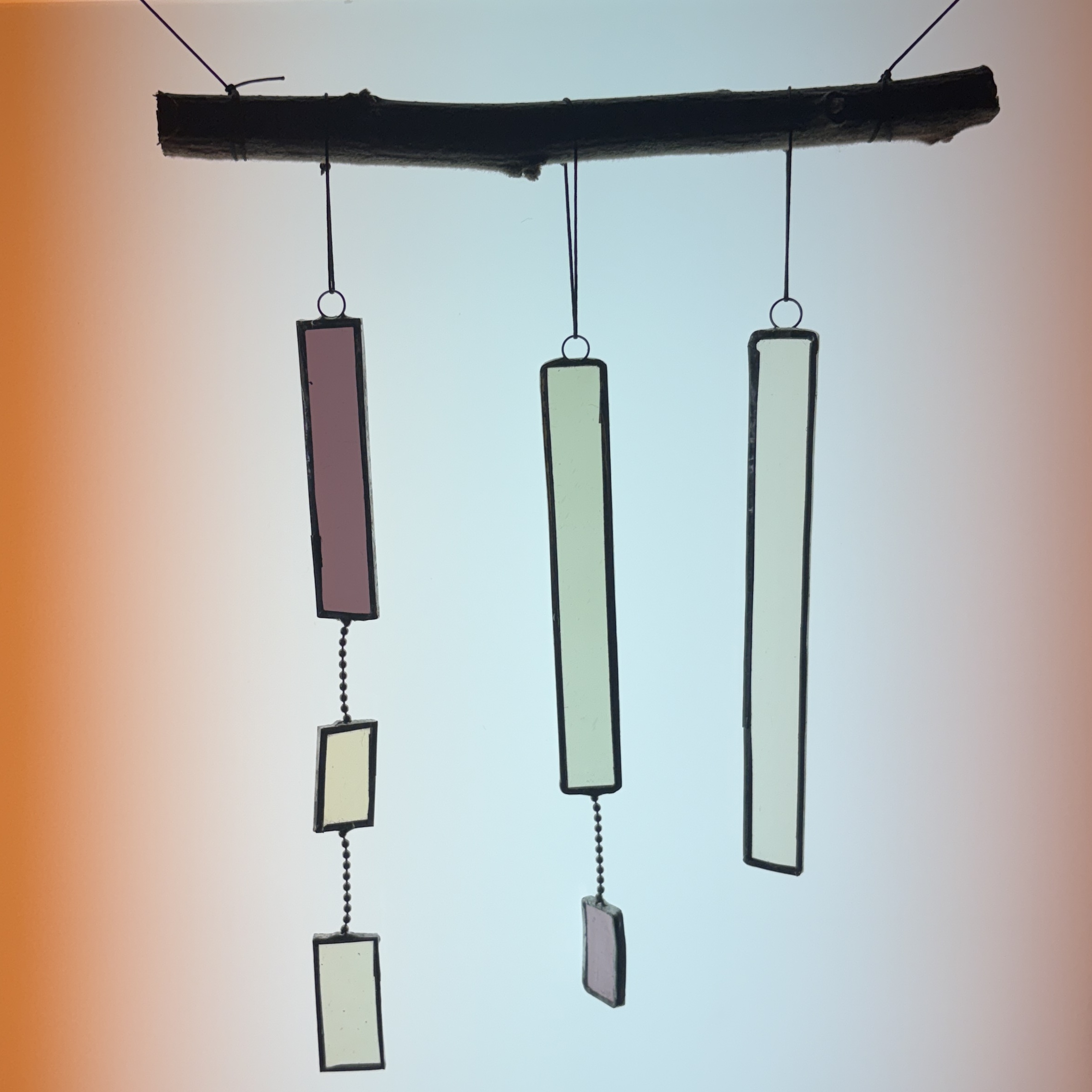 Oud glas in stroken, bewerkt met tiffany techniek en opgehangen aan een fluweelboom takje. Leuk cadeau voor de feestdagen!